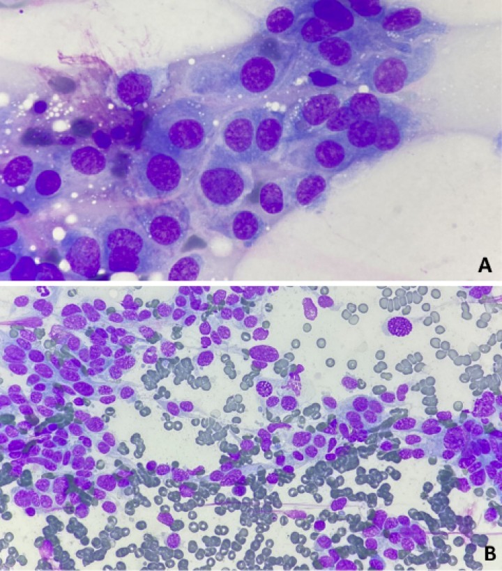 Citologías de los aspirados realizados mediante ecografía tanto de la lesión mediastínica (A 100x) como del nódulo esplénico (B 40x) mediante tinción panóptica rápida (Wright modificado) caracterizadas por la presencia de una población de células no cohesivas fusiformes a estrelladas con hemofagocitosis y numerosos criterios de malignidad.