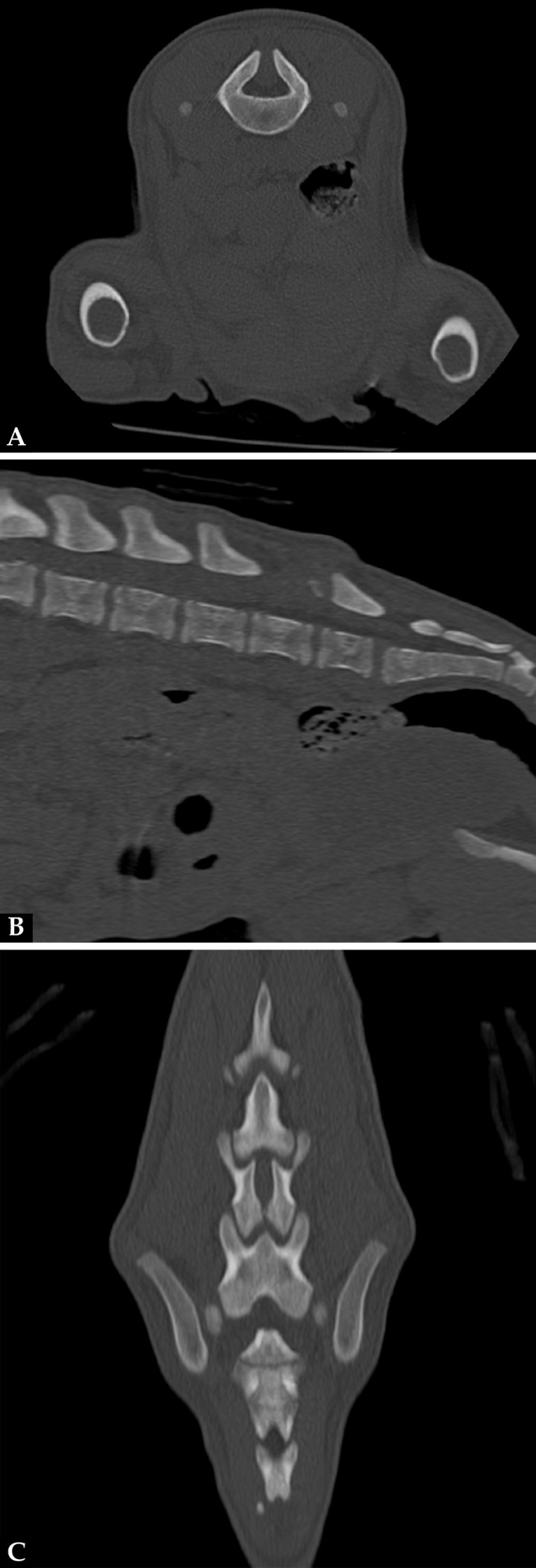Imágenes de TC en ventana de hueso. (A) Plano transversal. (B) Reconstrucción en plano sagital. (C) Reconstrucción en plano dorsal. Hipoplasia de la apófisis espinosa de L6 sin fusión de las láminas dorsales dejando un espacio abierto que comunica el canal vertebral y el tejido blando lumbar caudodorsal a L6